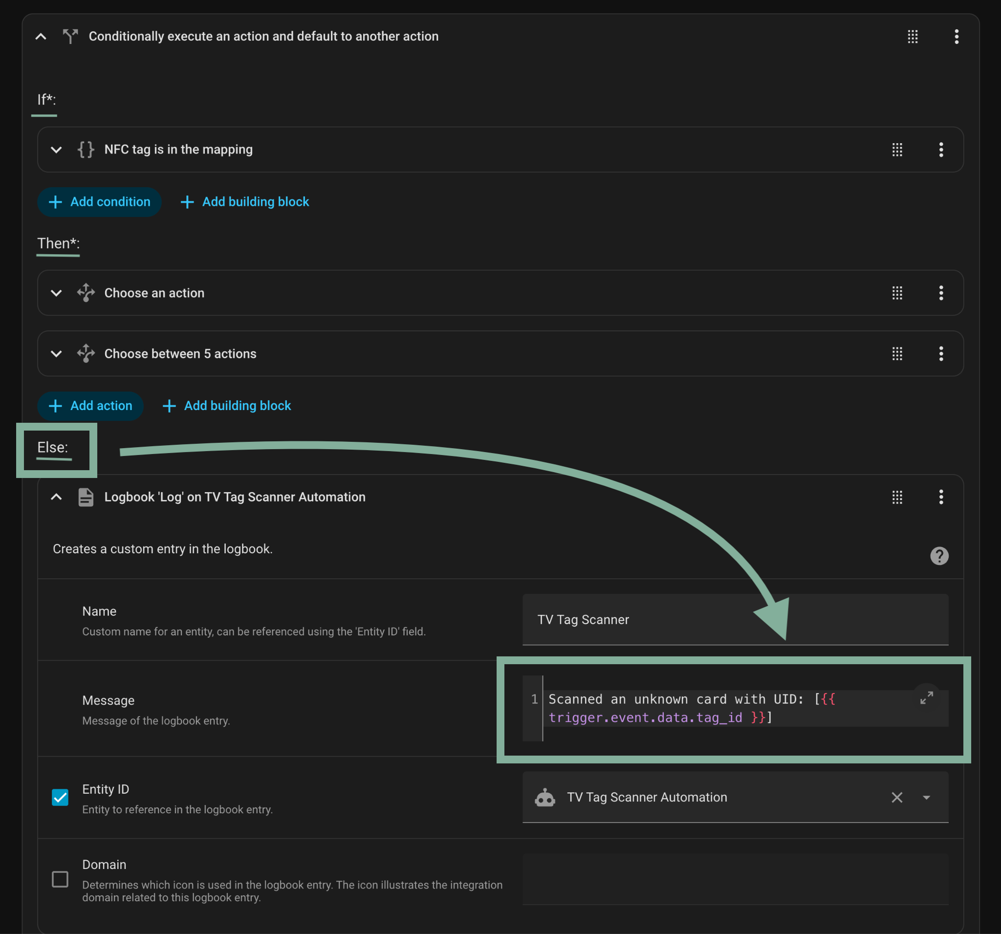 The "Else" clause of the automation, printing the card's Tag ID to the Logbook