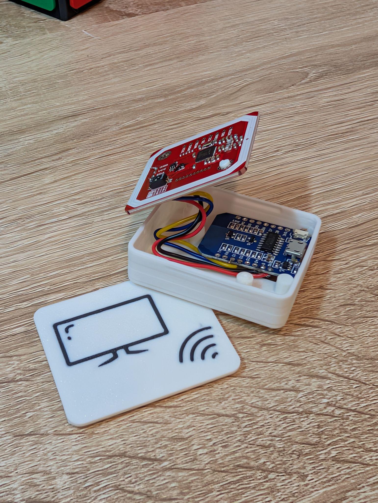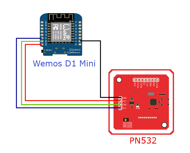 The circuit is straightforward: connecting an NFC reader module (PN532) to a microcontroller (ESP8266WeMos D1 mini).