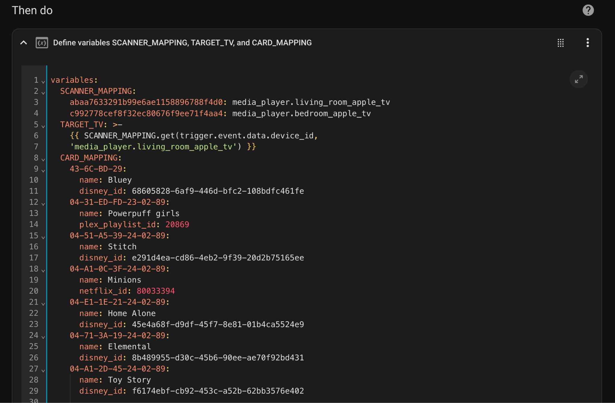 The automation's variables, we'll mostly update CARD_MAPPING with Tag IDs and content IDs