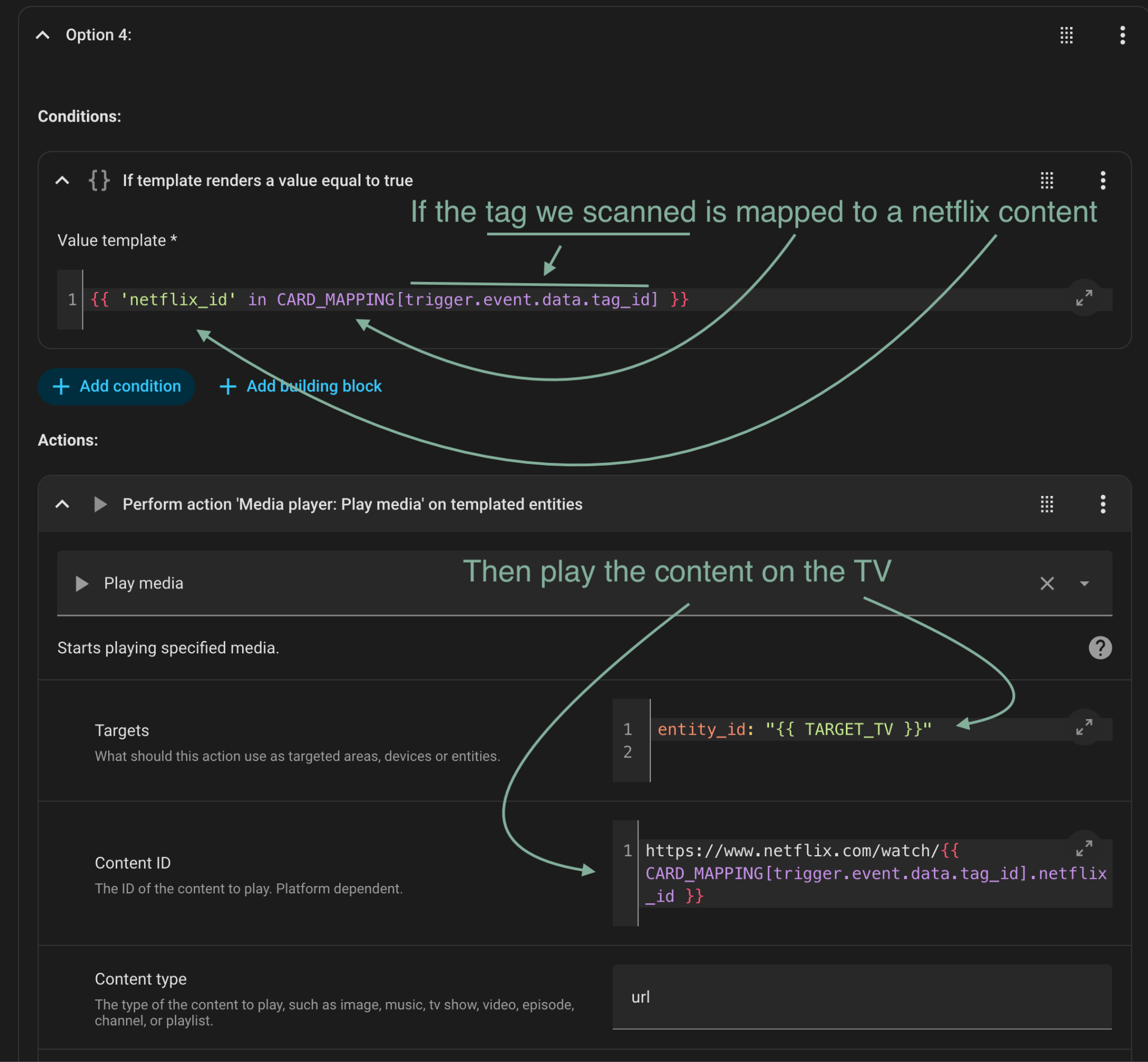 There are a few ways to set up the automation. I liked the structure Xavier at Simply Explained shared, it keeps the mapping of Tag IDs to content easy to read and update.