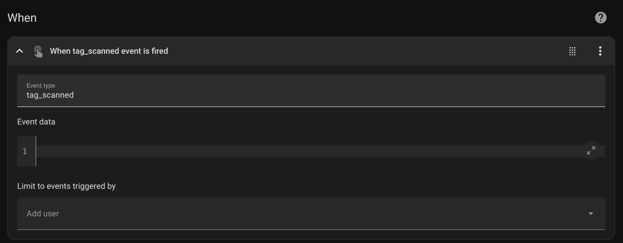 The trigger is a tag_scanned event, the same one we saw earlier when testing the scanner using the Developer Tools. The automation will be triggered when such an event is fired.