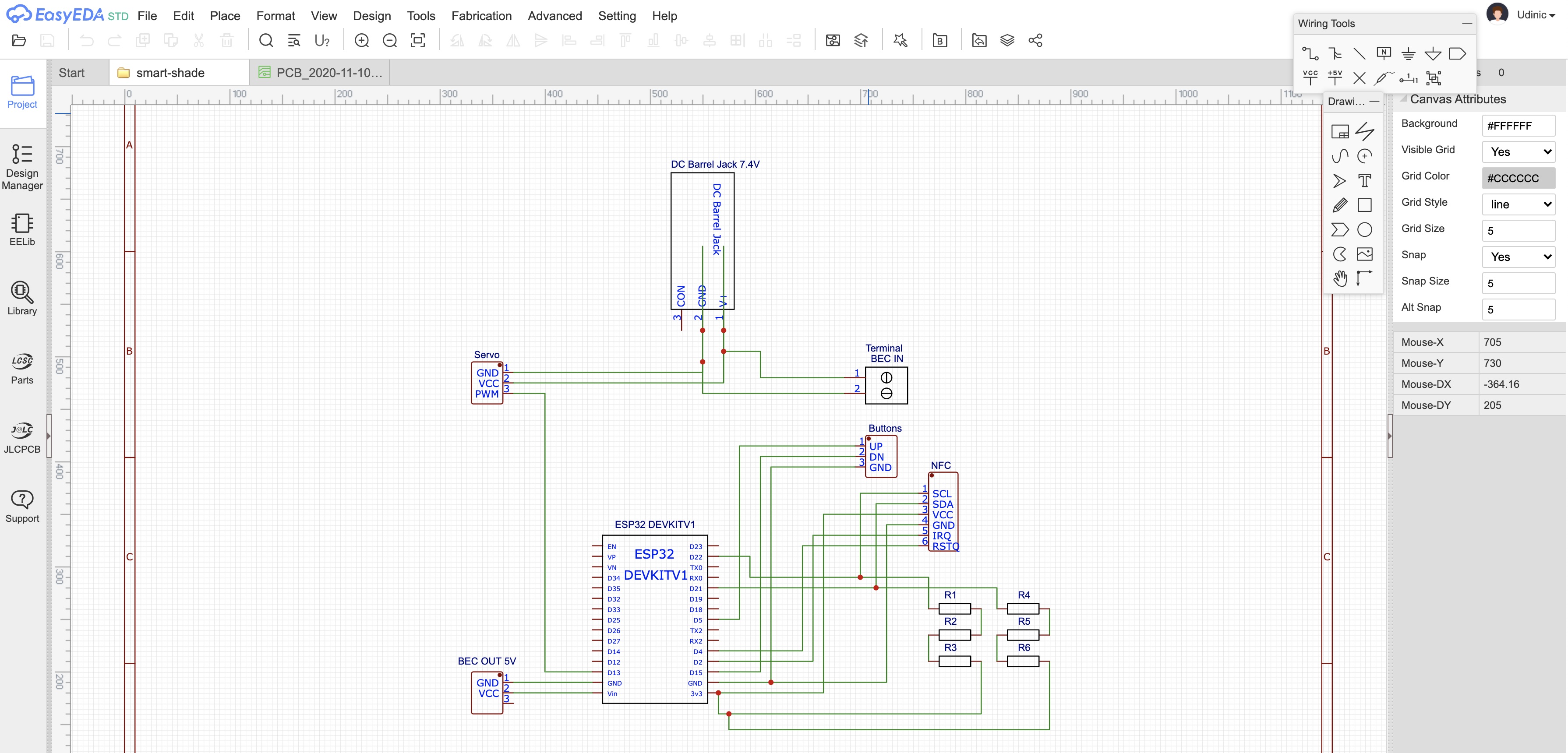 I never designed PCBs before, but it was simpler than I thought. I found EasyEDA, which is an online tool (and a Mac app) for designing PCBs and also ordering them directly from the tool. I started by creating the schematic design of my circuit: