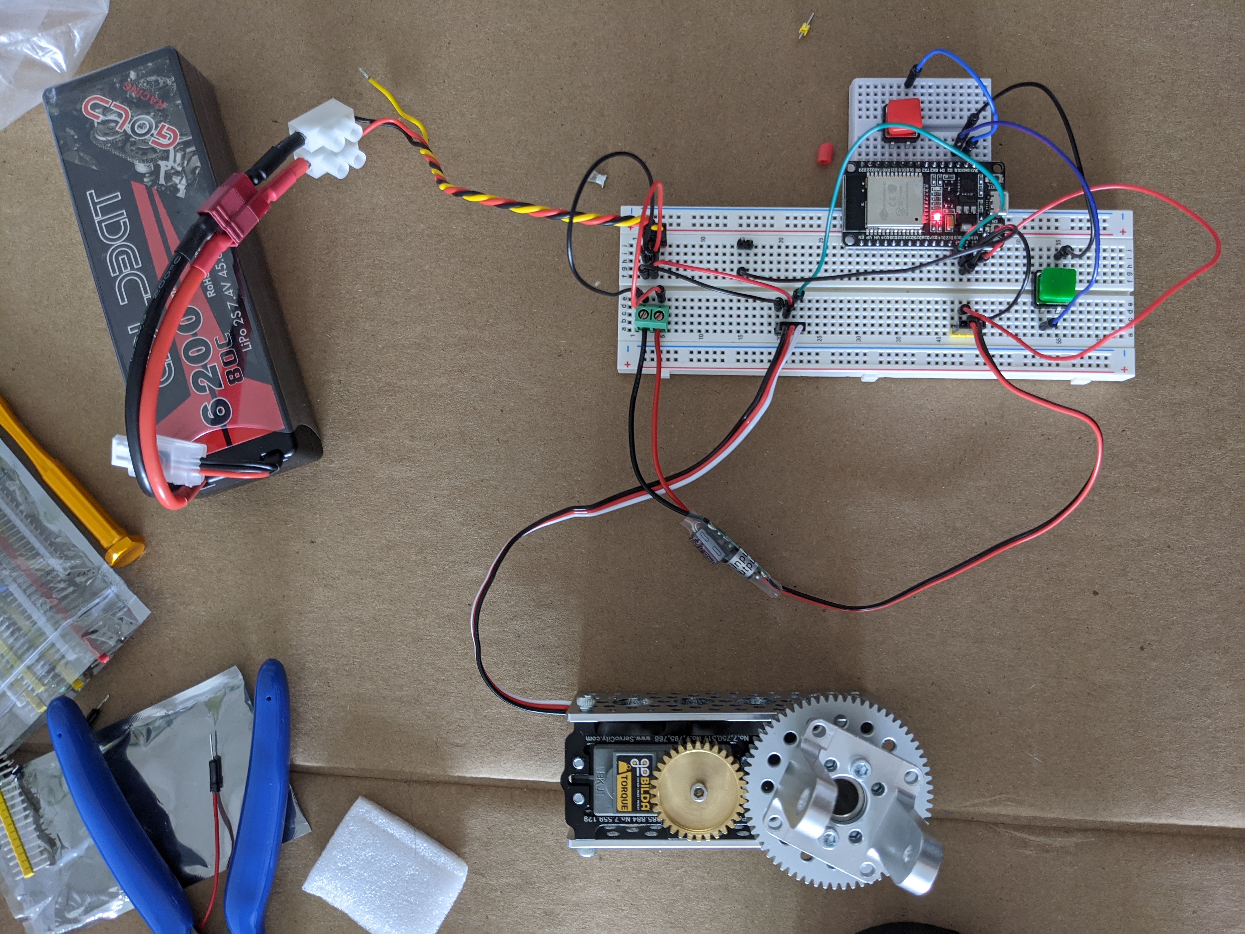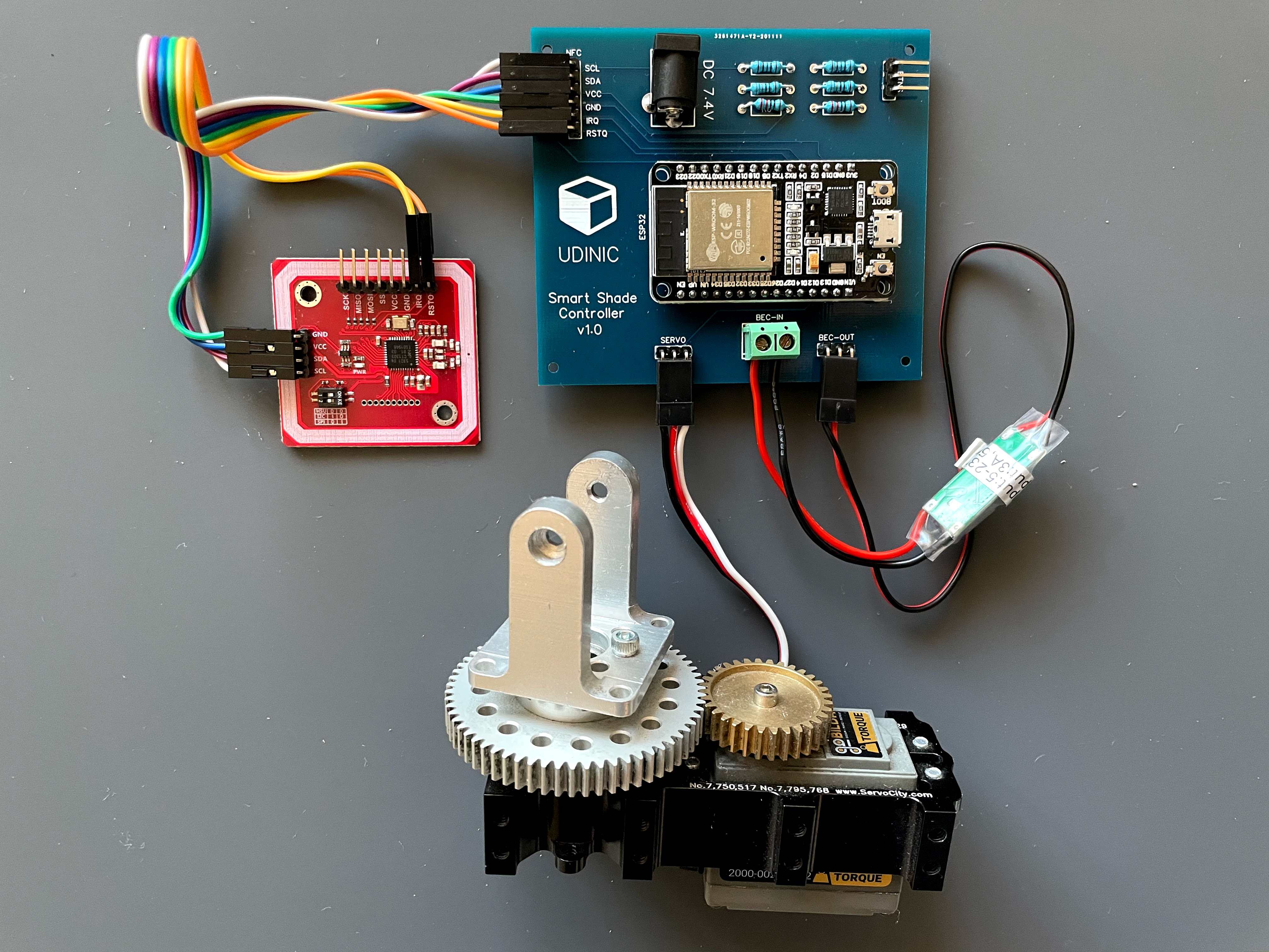I also recommend having a simple way to use the circuit in a development environment. After I mounted the motor and the switch box, I was still able to take the main circuit to my desk and debug problems using a simpler motor and remote. I also added a flag in the code for disabling the NFC, so I won’t have to connect an NFC module in my development environment unless I need to. This was really convenient and greatly improved my development process.