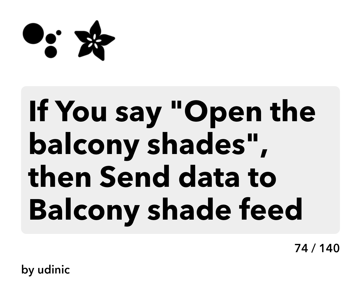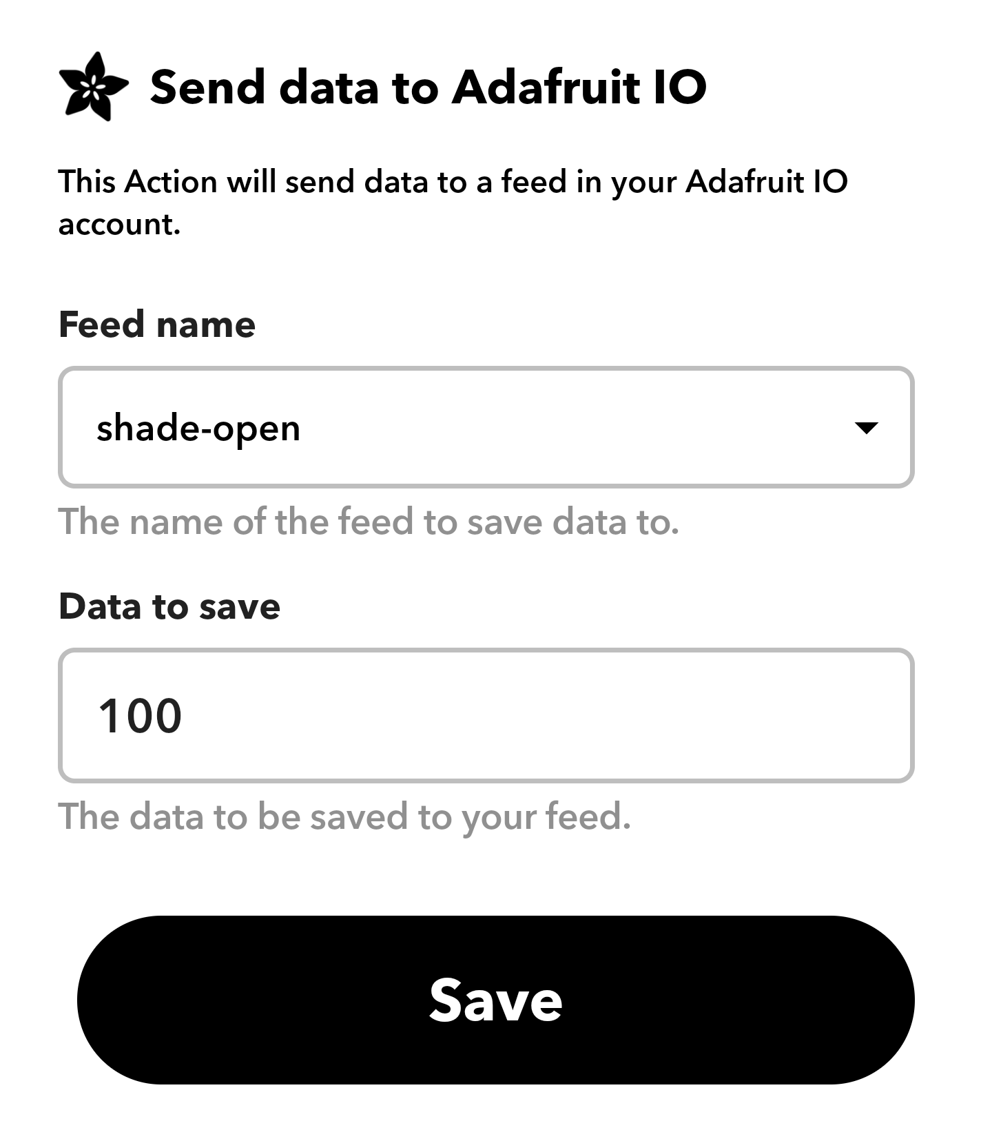 IFTTT (If-this-then-that) is a great tool for connecting different web services and products to each other. It supports integrations with Google Assistance and Adafruit IO, so all I needed to do is authenticate to both services and create rules (called “Applets”) to communicate between them. For my use case, I created an applet that reacts to a Google Assistant command to open or close the shade and sends data to a specific feed on my Adafruit IO account.