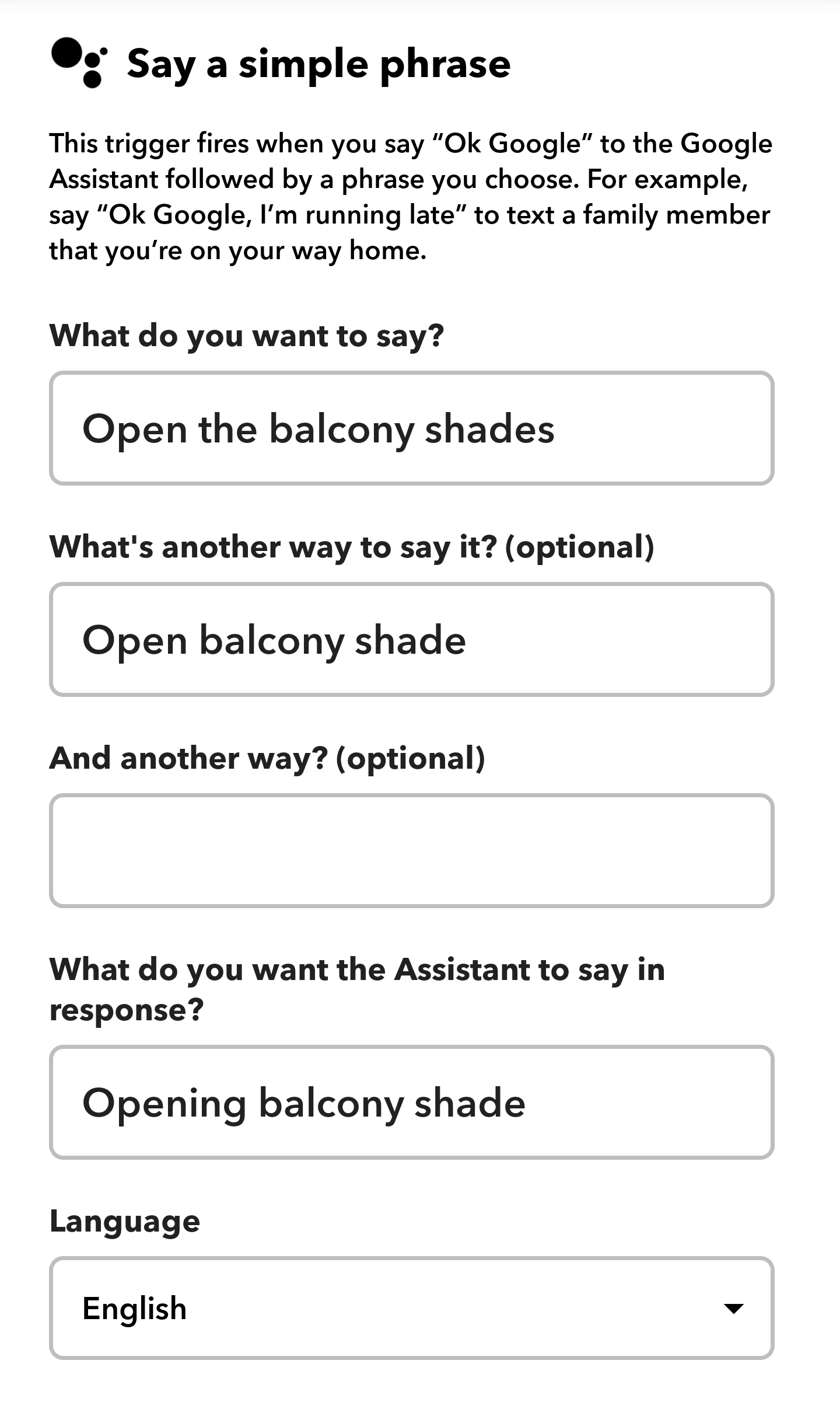 My IFTTT configuration for opening the shade from Google Assistant.