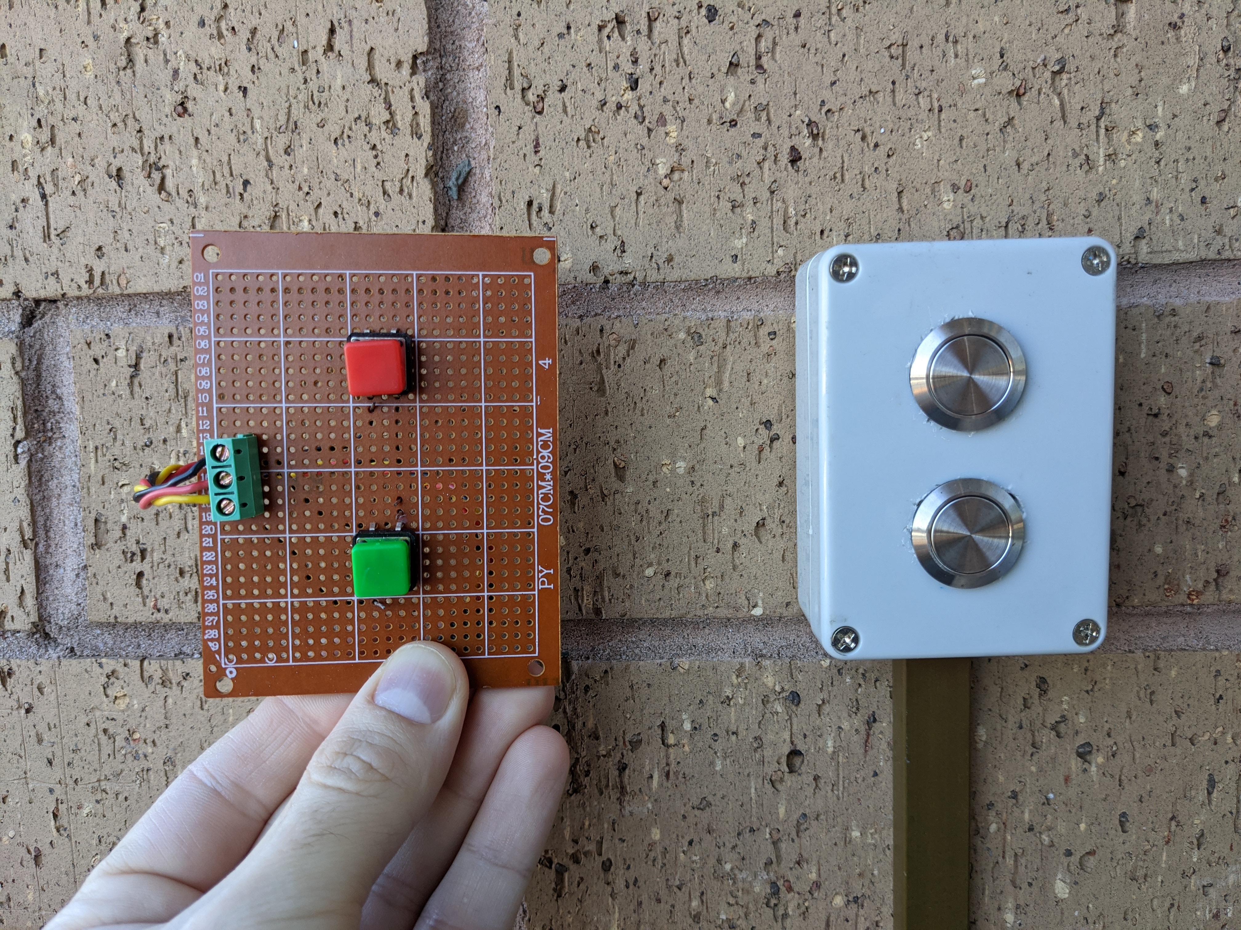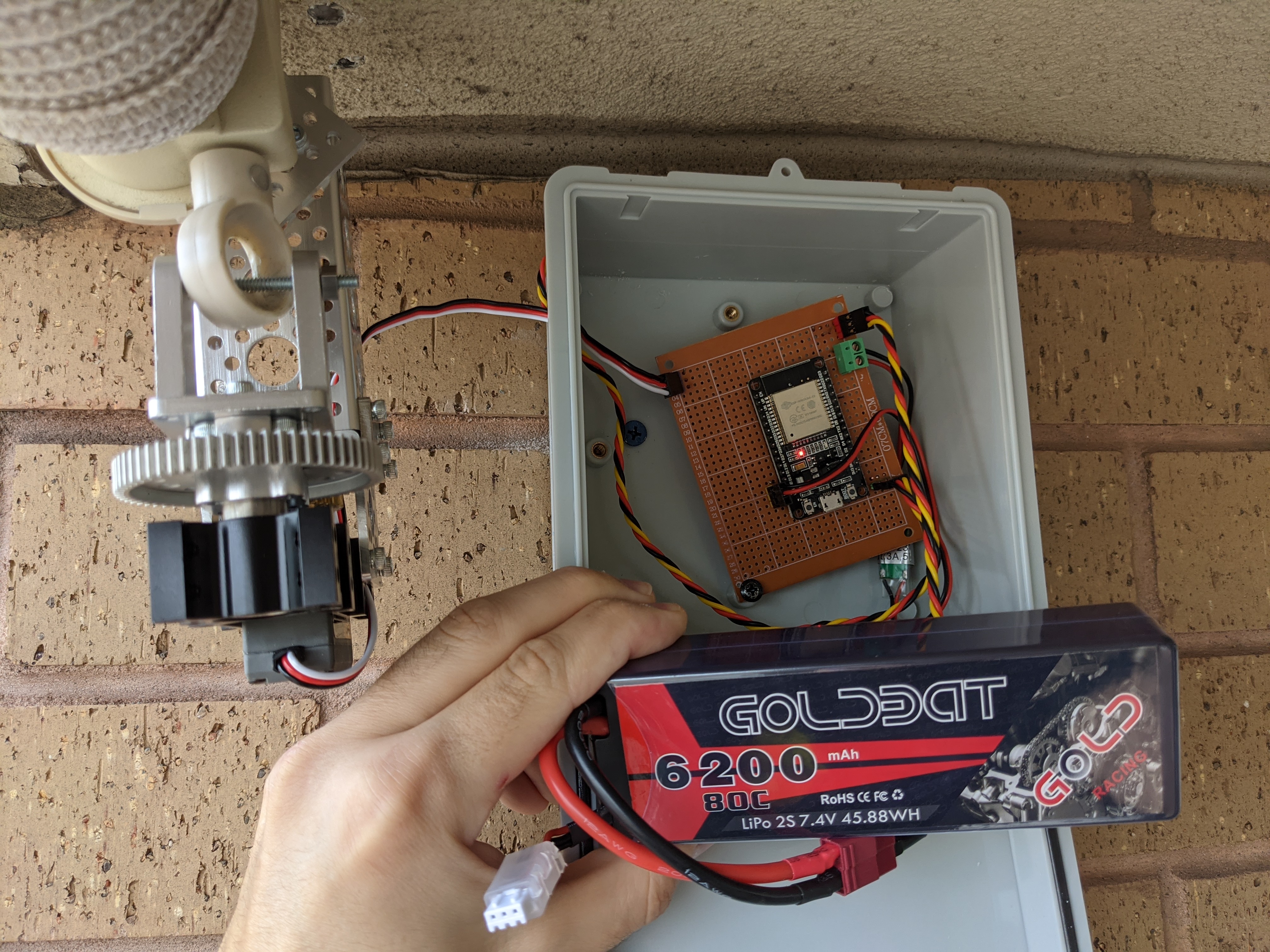I drilled a couple of holes into a waterproof plastic box, where I installed the 2 waterproof buttons. I organized all the wires inside cable channels to protect them from the rain, and more importantly - my kids. Besides the robustness of the new switch box, it’s also a lot nicer than that hacky-looking remote.