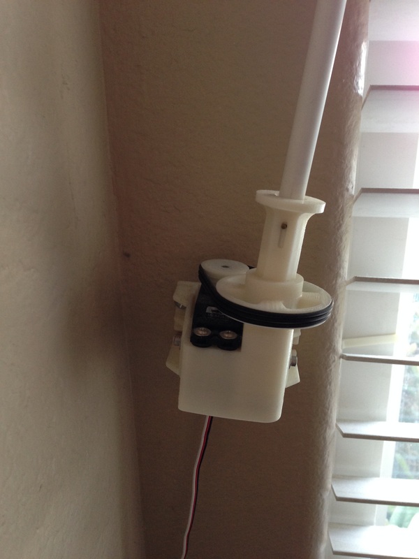 I found a strong motor, designed a circuit and programmed a microcontroller to run the show. I mounted a switch box with up/down buttons and used NFC to support “shade presets”. Finally, I got everything connected to the internet and respond to voice commands from Google Assistant. The result: