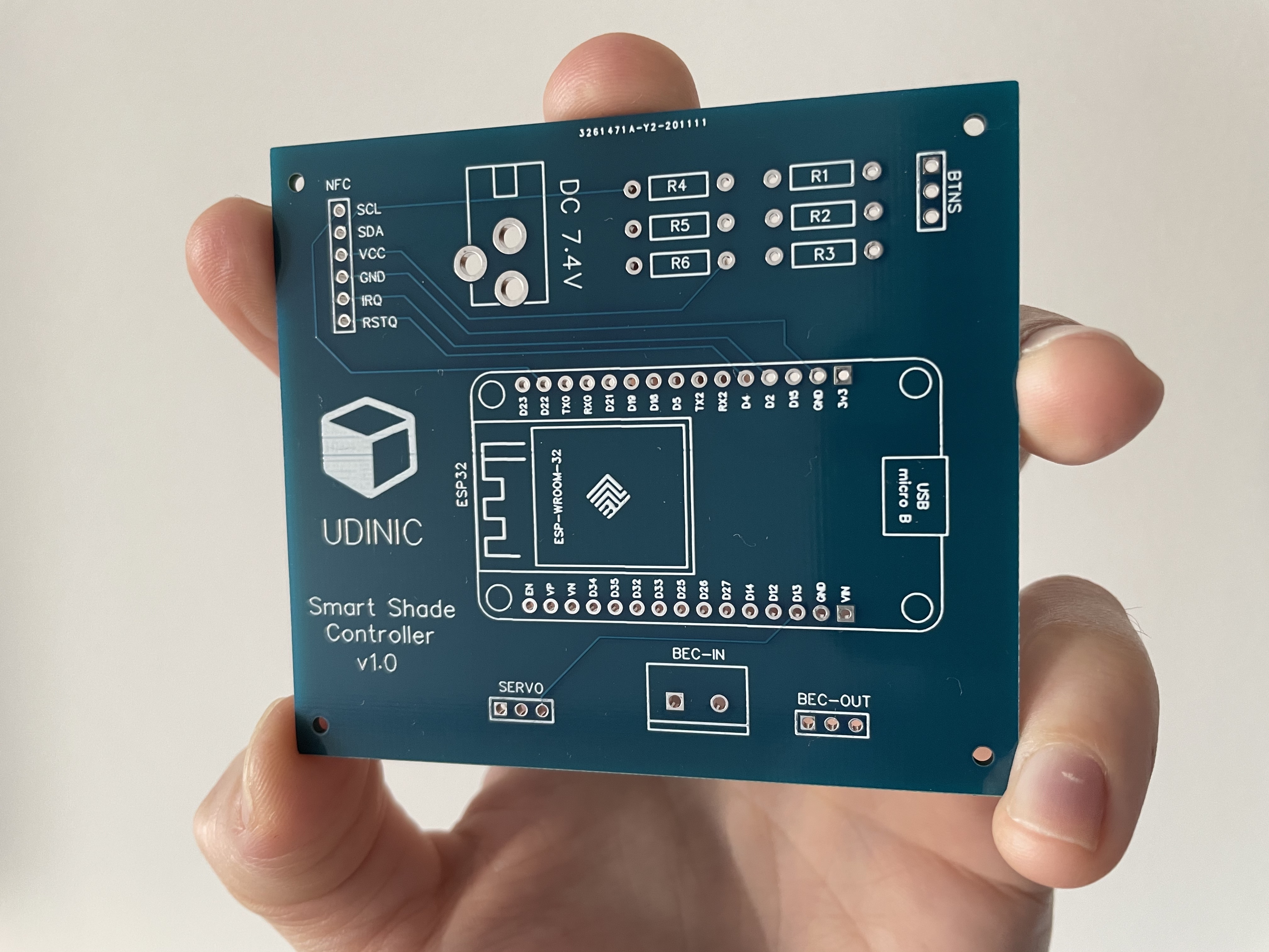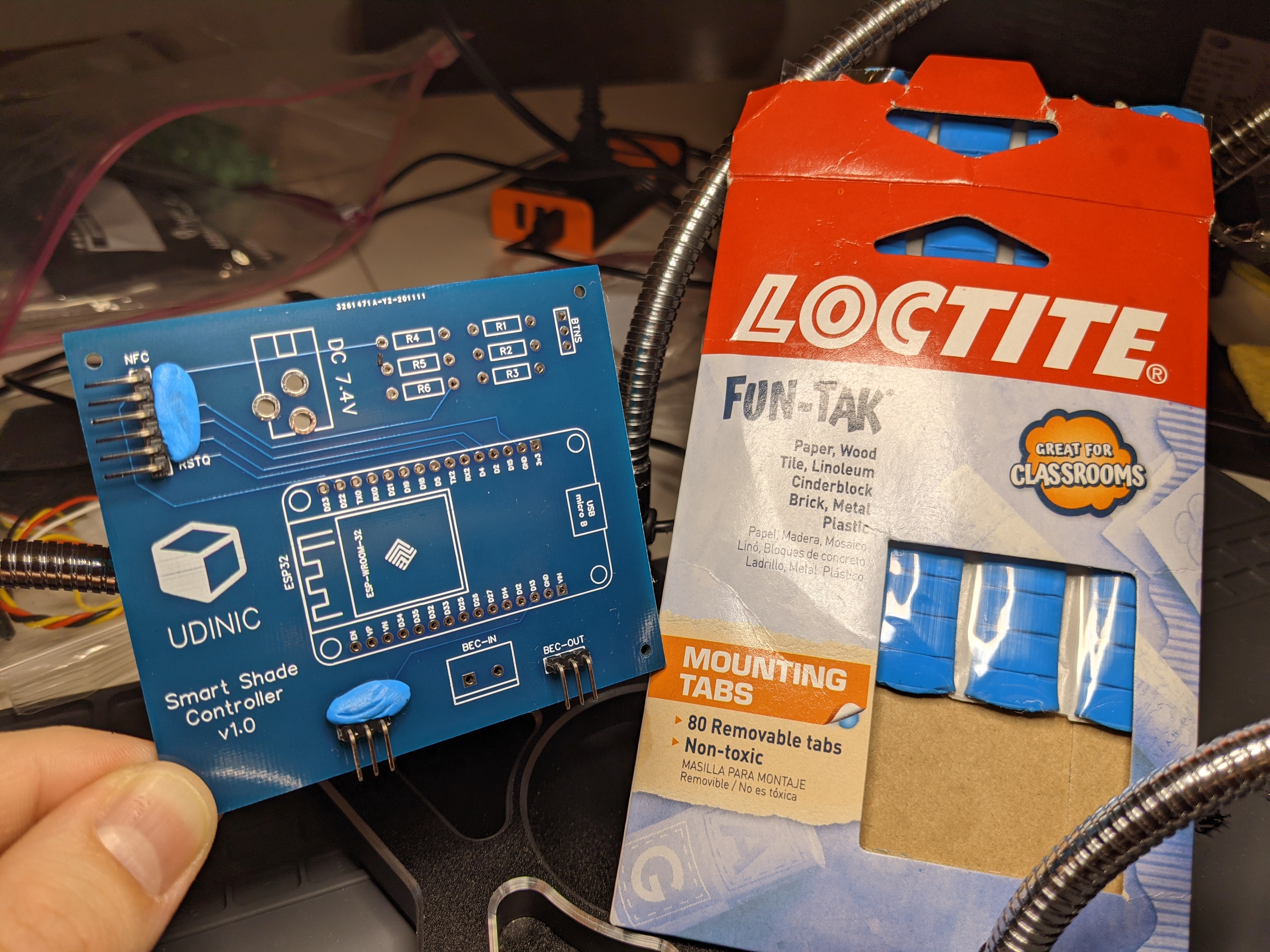 The main circuit used to sit inside its own box next to the motor, but that was before I added the NFC module. For a cleaner look, I put both of them in the same box and mounted it on that plastic sheet the shade is resting on. The NFC module is still positioned close enough to read NFC tags from the shade.