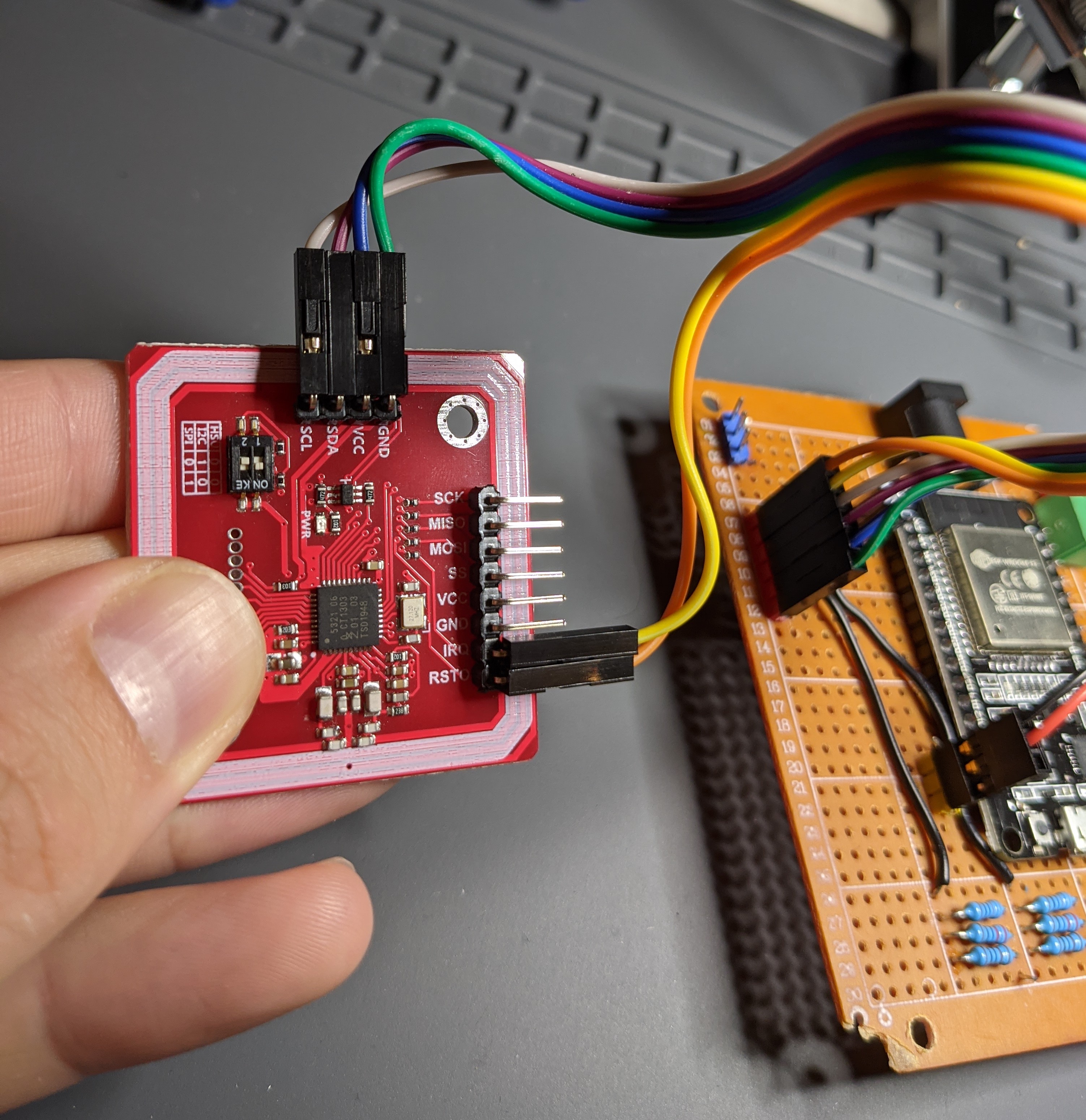 One critical step to note here: set the PN532’s mode correctly. The board has tiny DIP switches to toggle between I²C and SPI. Make sure these match your chosen mode - otherwise you’ll be staring at a non-responsive scanner and wondering why nothing works. Let’s just say I learned that lesson the hard way…