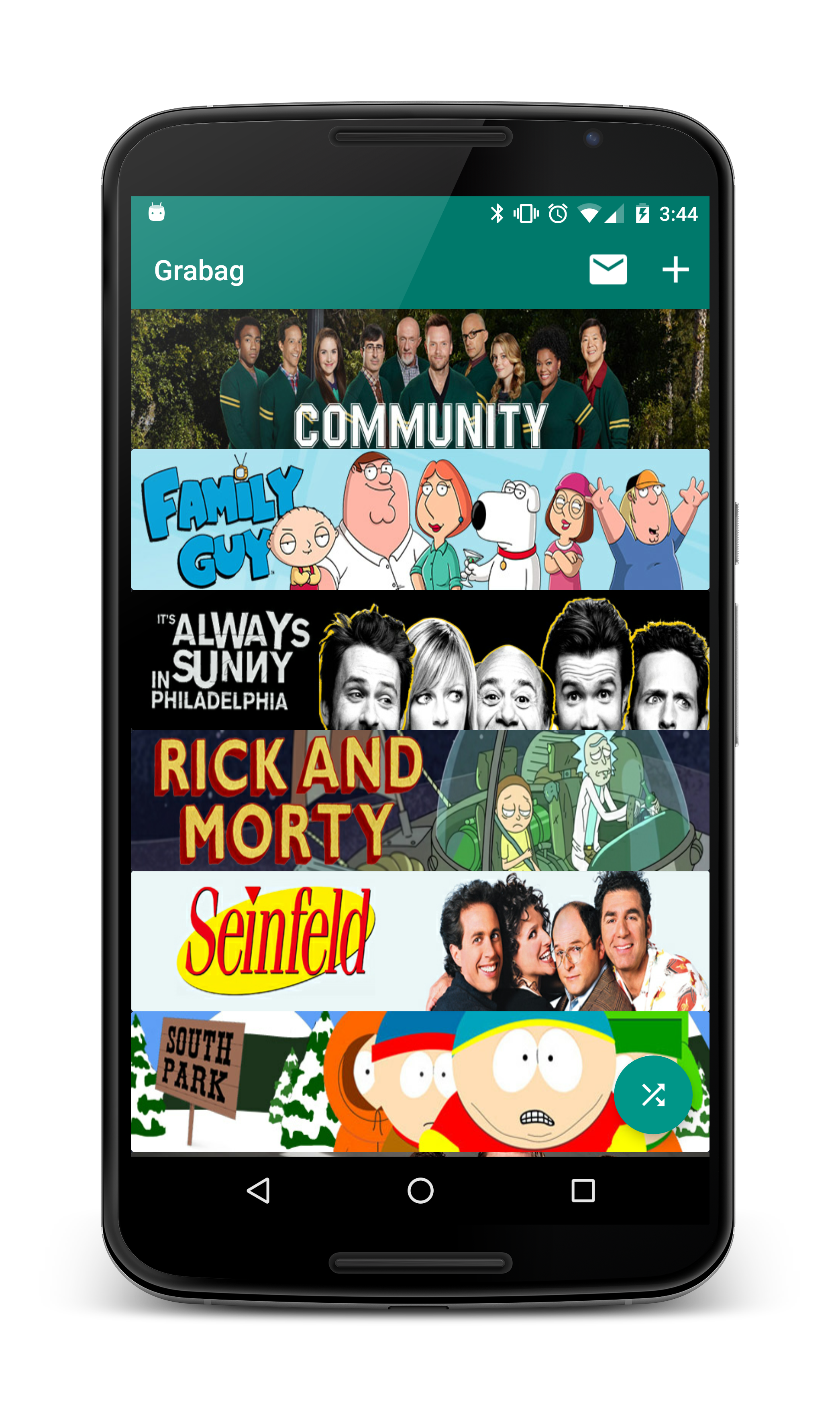Grabag (Grab Bag) is very simple - pick the shows you like, and the app will randomly select an episode for you, along with a short description and a direct link to open it on an app that streams it (e.g. Hulu, HBO Go, Google Play). Here’s the main screen, where all the selected shows are listed: